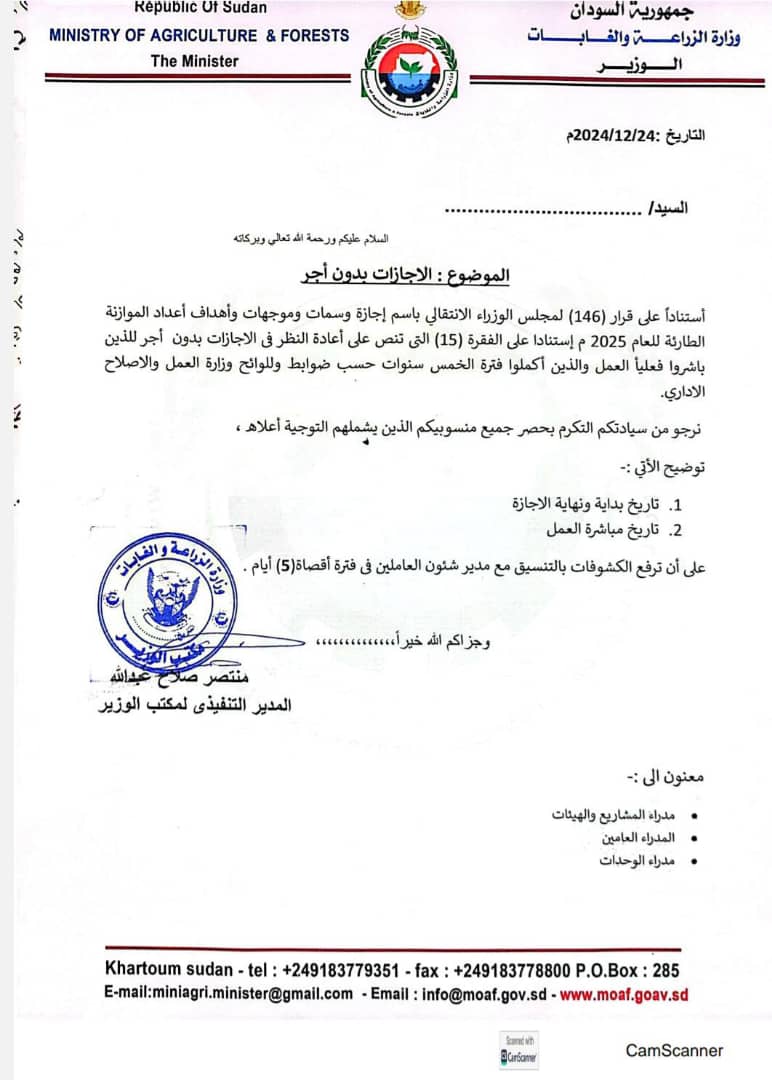 عبر عدد من المدراء العاميين ورؤساء الإدارات بوزارة الزراعة الإتحادية عن تذمرهم حول مخاطبة سكرتير وزير الزراعة لعدد (11)مدير عام التابعين للوزارة ومدراء المشاريع القومية بما فيهم مدير مشروع الجزيرة والرهد والسوكي ومدراء الهيئات منها مدير عام هيئة البحوث الزراعية بدرجة بروف ومدير عام هيئة الغابات ومدير عام هيئة المخزون الاستراتيجي وكذلك خاطب مدراء الوحدات المتخصصة والذين هم في أعلى درجة من المدراء العاميين بدرجة وزير دولة يخاطبهم موظف في الدرجة الثامنة.