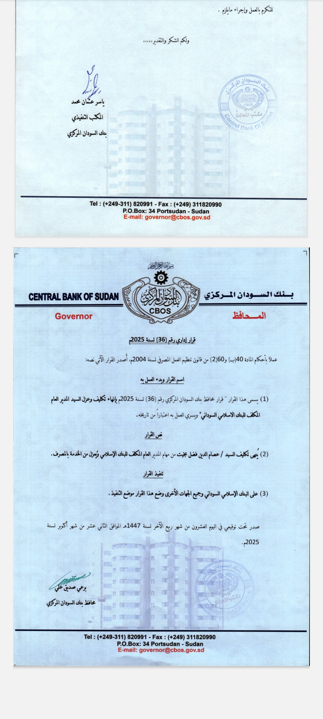 اصدر محافظ بنك السودان المركزي المقال امس برعي الصديق قراز باايقاف البنك الاسلامي السوداني من مزاولة أعمال النقد الاجنبي وانهاء تكليف المدير العام للبنك عصام الدين فضل بخيت ،كما تم انهاء خدمة عدد من مديري الادارات ادارة الالتزم والمراجع الداخلية ،ومدير الادارة الدولية واداراة المخاطر ، كما وجه البنك الجهات الاخري وضع القرار موضع التنفيذ ..
