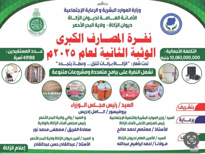 أعلنت الأمانة العامة لديوان الزكاة بالتعاون مع ديوان الزكاة بولاية البحر الأحمر ، ووزارة الموارد البشرية والرعاية الاجتماعية ، عن قيام النفرة الكبرى لديوان الزكاة ، الوثبة الثانية ، تحت شعار “الزكاة بركات تتنزل وعطاء يتجدد” ، مستهدفة عدد من المستفيدين 49188 مستفيد ، باجمالي تكلفة بلغت اكثر من 10 ترليون جنيه.