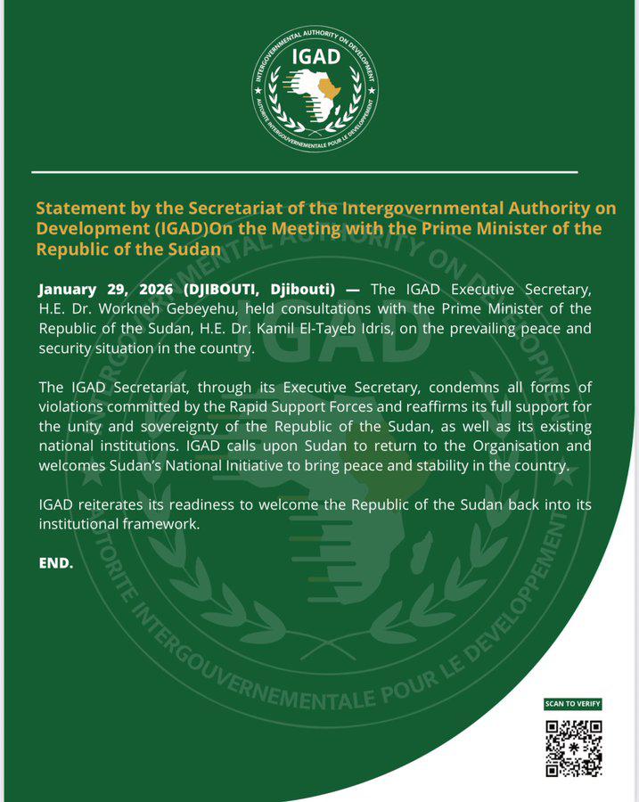 ​وجاء هذا التحول في موقف المنظمة الإقليمية عقب مباحثات رسمية أجريت في جيبوتي بين السكرتير التنفيذي للهيئة الدكتور ورقني قبيهو، ورئيس الوزراء الدكتور كامل إدريس، حيث استعرض اللقاء تطورات الأوضاع الراهنة في البلاد وسبل إنهاء الحرب واستعادة الاستقرار السياسي والمؤسسي.