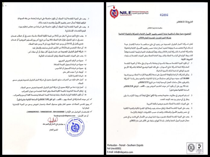 تعلن شـركـة النيل للبترول المحـدودة عن رغبتها في طرح مناقصـة عـامـة لإختيار جهـة إسـتشـارية/متخصصـة ومؤهلة لتنفيذأعمال إعادة حصـر وتقيم الأصـول الثابتة والمنقولة و المتحركة الخاصة بالشـركة للعام 2026)م وذلك وفقاً للمتطلبات الفنية والمهنية المعتمدة ووفقاً للشـروط الواردة في كراسـة العطاء والشـروط العامة للعطاء وعلى الجهة المتقدمة إستيفاء